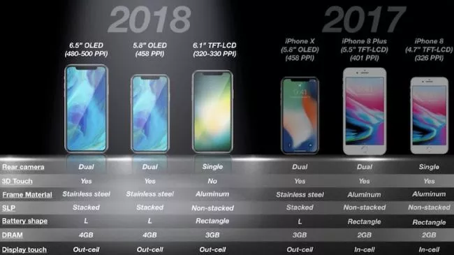 Last year Apple had it’s first smart phone with OLED display, so it will not be a surprise if newest models will have the same. As some commentators predict there will be three different models - 6.5-inch OLED, a 5.8-inch OLED and a 6.1-inch LCD model. The pixel density of a 6.5-inch OLED model may range between 480 and 500ppi, a 5.8-inch OLED model may offer 458ppi and a 6.1-inch LCD model - 320 and 330 pixels per inch.